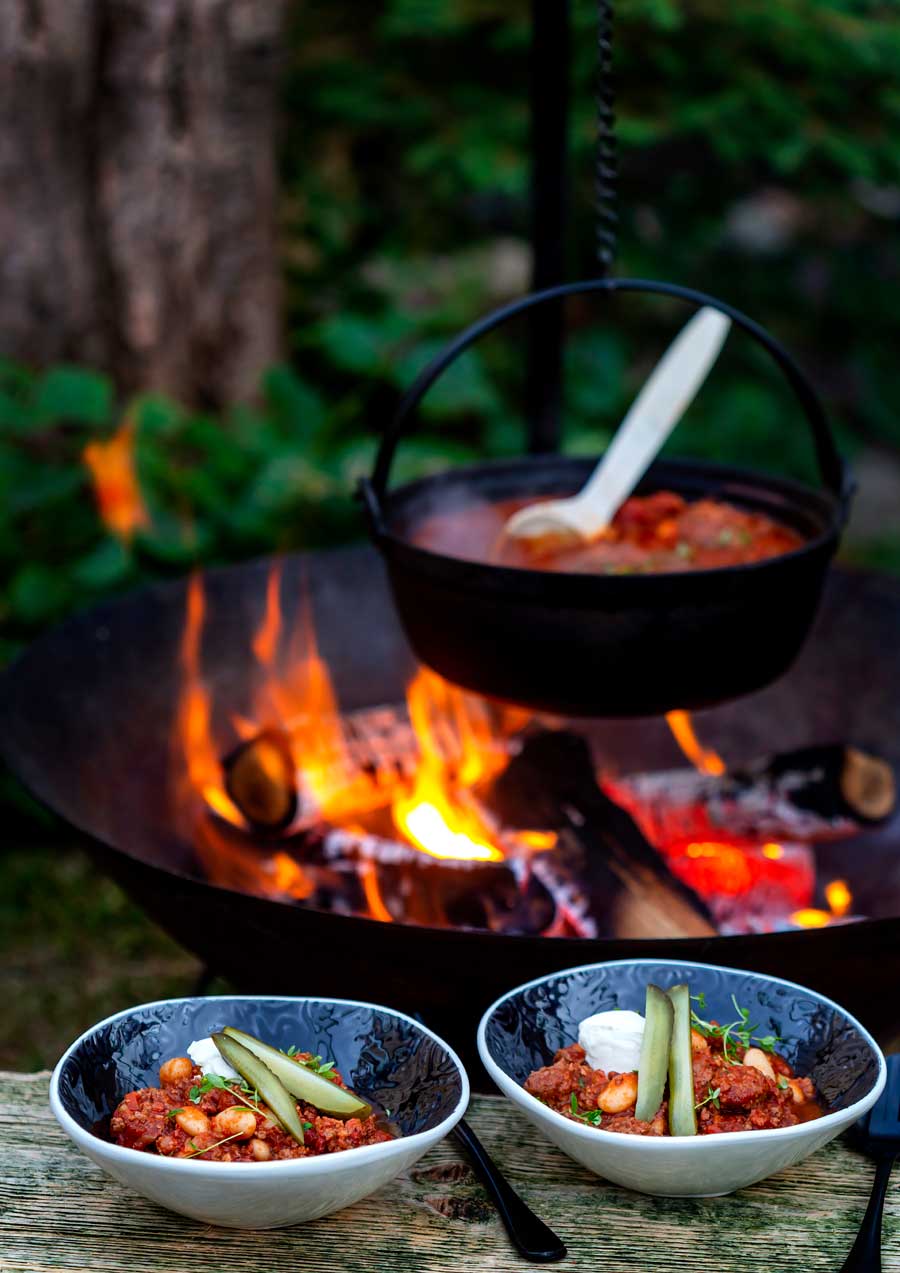 Hetta upp smöret i en rymlig kastrull. Bryn lök, vitlök, fläsk och viltfärs tills det fått färg. Tillsätt tomatpuré och kryddor, låt det bryna någon minut till. Tillsätt krossad tomat och fond, tillsätt vatten tills vätskan täcker kött och grönsaker. Låt grytan koka långsamt i 2 timmar. Späd med vatten om det behövs. Skölj bönorna och låt dem rinna av i en sil. Rör i bönorna och låt grytan koka ytterligare i 5 minuter. Smaka av och servera tillsammans med inlagd gurka och gräddfil.