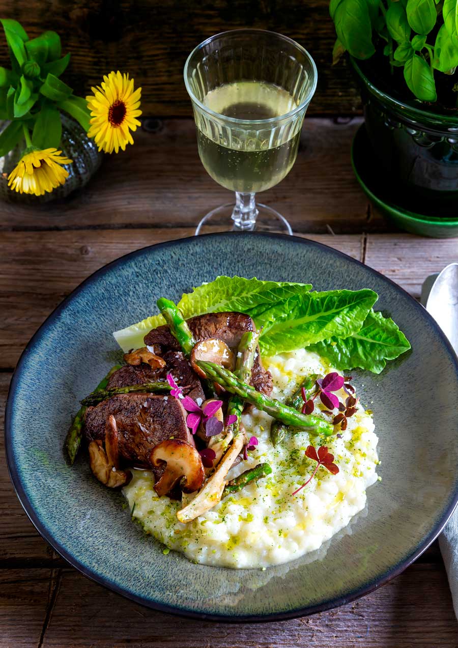 Koka upp fonden håll den varm. Stek lök och vitlök sakta några minuter i oljan. Rör i riset och låt det steka ytterligare en minut tills riset blir blankt. Tillsätt vinet och låt det koka in i riset. Späd successivt med varm fond och rör kontinuerligt. Efter ca 20 minuter så är riskornen genomkokta men fortfarande spänstiga. Tillsätt smör och ost, smaka av med salt och peppar. Skär köttet i små medaljonger och stek dem i smör. Servera risotton i djupa tallrikar tillsammans med svamp, sparris och kött.