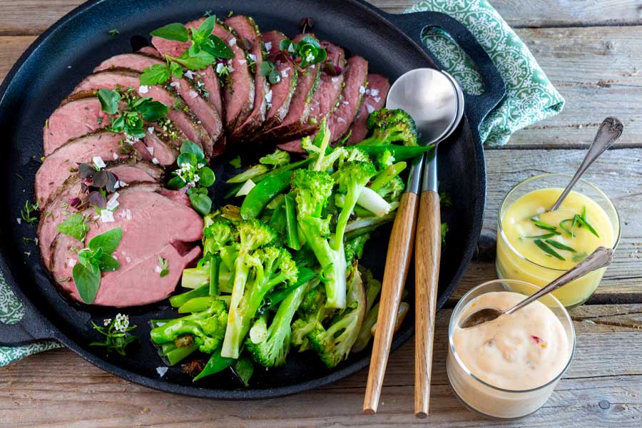 Stek därefter köttet i ugn, 120 grader i ca 40 minuter till en innertemperatur på 55-60 grader.