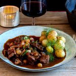 4 personer 600g putsat framdelskött från vildsvin 200g rökt sidfläsk 200g champinjoner 2 stora schalottenlökar 1 msk tomatpuré 2 msk